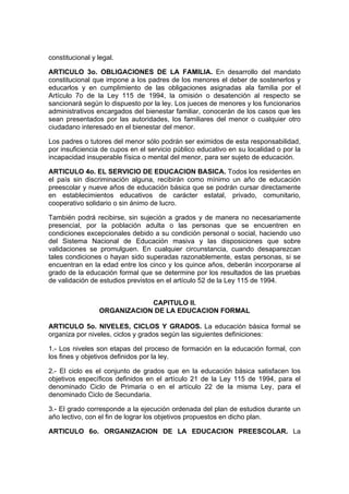 Este decreto reglamenta parcialmente la Ley 115 de 1994 en aspectos pedagógicos y organizativos generales. Establece que la educación básica obligatoria comprende un año de preescolar y nueve años de educación básica, y organiza la educación en niveles, ciclos y grados. Además, define las responsabilidades de los padres y del Estado en la educación de los menores, y establece lineamientos sobre la organización de los diferentes niveles educativos formales.