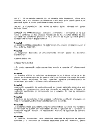 Este decreto establece las normas para el manejo de desechos sólidos no peligrosos en Venezuela. Asigna la responsabilidad de la gestión de desechos a las municipalidades y establece requisitos para las operaciones de recolección, transporte, procesamiento, y disposición final en rellenos sanitarios. También define términos clave relacionados con el manejo de desechos sólidos.