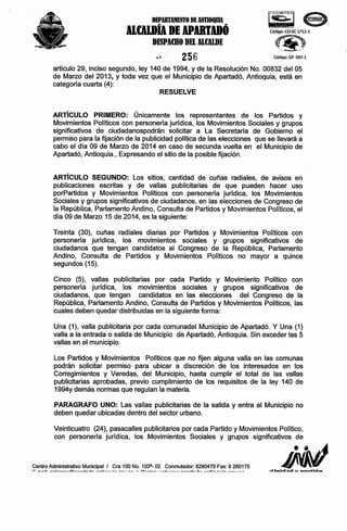 Este decreto regula la cantidad de cuñas radiales, avisos escritos y vallas publicitarias que pueden usar los partidos políticos, movimientos sociales y grupos ciudadanos en Apartadó, Antioquia para las próximas elecciones. Se especifica que 105 grupos podrán solicitar permiso para 30 cuñas radiales diarias, 5 vallas publicitarias, 24 pasacalles y otros elementos de propaganda políticos definidos. El decreto también prohíbe la propaganda el día de las elecciones y establece fechas límite para ret