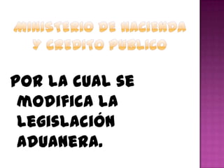 El documento habla sobre la modificación de la legislación aduanera en Colombia. Busca facilitar y agilizar las operaciones de comercio exterior para brindar más transparencia y certeza a los usuarios. Define varios términos relacionados con el comercio internacional y trámites aduaneros como depósito, abandono, tránsito aduanero, agente de aduanas, entre otros.