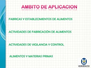Este documento establece las normas sanitarias para la fabricación, procesamiento, envasado, almacenamiento, transporte, distribución y comercialización de alimentos. Incluye definiciones, requisitos de instalaciones, equipos, personal manipulador, prácticas higiénicas, control de calidad, importaciones y exportaciones. El objetivo es garantizar la inocuidad y salubridad de los alimentos en todas las etapas de la cadena alimentaria.