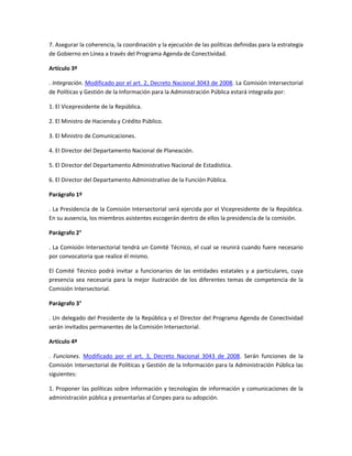 Este decreto crea la Comisión Intersectorial de Políticas y Gestión de la Información para la Administración Pública con el objetivo de definir estrategias para la producción y gestión de información del gobierno, garantizar el acceso a información para los ciudadanos, y optimizar el uso de tecnología en la administración pública. La Comisión estará integrada por varios ministros y directores de departamentos gubernamentales y tendrá un Comité Técnico de apoyo.