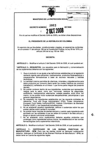 Este decreto modifica el Decreto 3249 de 2006 para establecer nuevos requisitos para la fabricación y comercialización de suplementos dietarios en Colombia. Entre los cambios se incluyen: 1) establecer límites máximos permisibles para vitaminas, minerales y oligoelementos en los suplementos; 2) prohibir ingredientes que representen riesgos para la salud; 3) aceptar sólo ingredientes aprobados por agencias regulatorias internacionales; y 4) requerir certificados de buenas prácticas de manufactura para plantas productor