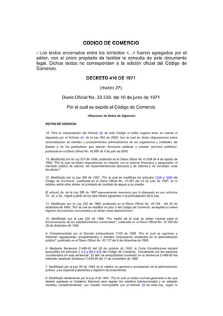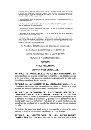 Este documento presenta el Código de Comercio de Colombia. Resume las notas de vigencia que indican las modificaciones realizadas a través de leyes y decretos. Luego presenta el Título Preliminar con disposiciones generales sobre la aplicabilidad de la ley comercial, la autoridad de la costumbre mercantil y la interpretación de los actos y convenios mercantiles. Finalmente, introduce el Libro Primero sobre los comerciantes y asuntos de comercio.