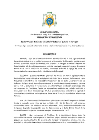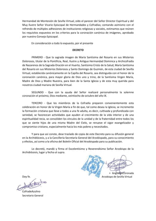 El Arzobispo decreta la coronación canónica de la imagen de María Santísima del Rosario en sus Misterios Dolorosos en la Hermandad de Montesión. La coronación se celebrará el 28 de octubre del año IX para mayor gloria de Dios y de la Virgen María. La Hermandad preparará adecuadamente esta celebración para fomentar la fe, la espiritualidad y la fraternidad entre los fieles.