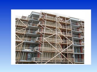 El documento describe los principales riesgos en la construcción y las regulaciones de seguridad establecidas en el Decreto 911/96. Algunos de los riesgos más comunes son las caídas, los golpes, los atrapamientos y los accidentes de tránsito. El decreto establece requisitos como la señalización adecuada, el uso de equipos de protección personal, medidas para excavaciones y trabajos en altura, e instalaciones sanitarias y de higiene en obras.