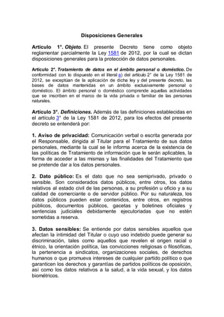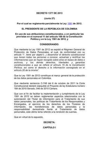 Este decreto reglamenta parcialmente la Ley 1581 de 2012 sobre protección de datos personales en Colombia. Establece disposiciones sobre la autorización del titular para el tratamiento de sus datos, incluyendo la recolección de datos, autorización para datos sensibles y revocatoria. También define términos como aviso de privacidad, datos públicos y sensibles, transferencia y transmisión de datos.