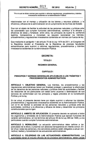 Este decreto tiene como objetivo suprimir o reformar los trámites, procedimientos y regulaciones innecesarios existentes en la Administración Pública colombiana con el fin de facilitar las actividades de las personas y entidades ante las autoridades públicas. El decreto establece principios como la moralidad, celeridad, economía y simplicidad en las actuaciones administrativas, y prohíbe la exigencia de documentos o pagos innecesarios. Además, promueve el acceso a la información pública y la atención preferencial a grupos vulnerables.