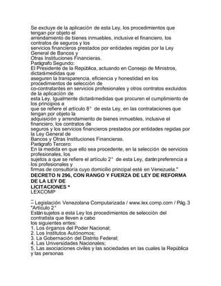 Este decreto reforma la Ley de Licitaciones de Venezuela para aumentar la transparencia en los procesos de selección de contratistas del estado. Se modifican varios artículos para ampliar el alcance de la ley e incorporar nuevos procedimientos como la Licitación Anunciada Internacionalmente. También se agregan secciones sobre el principio de transparencia y la clasificación de oferentes. El objetivo general es regular de manera más estricta los procesos de contratación para asegurar la honestidad, eficiencia y promoción de la competencia.