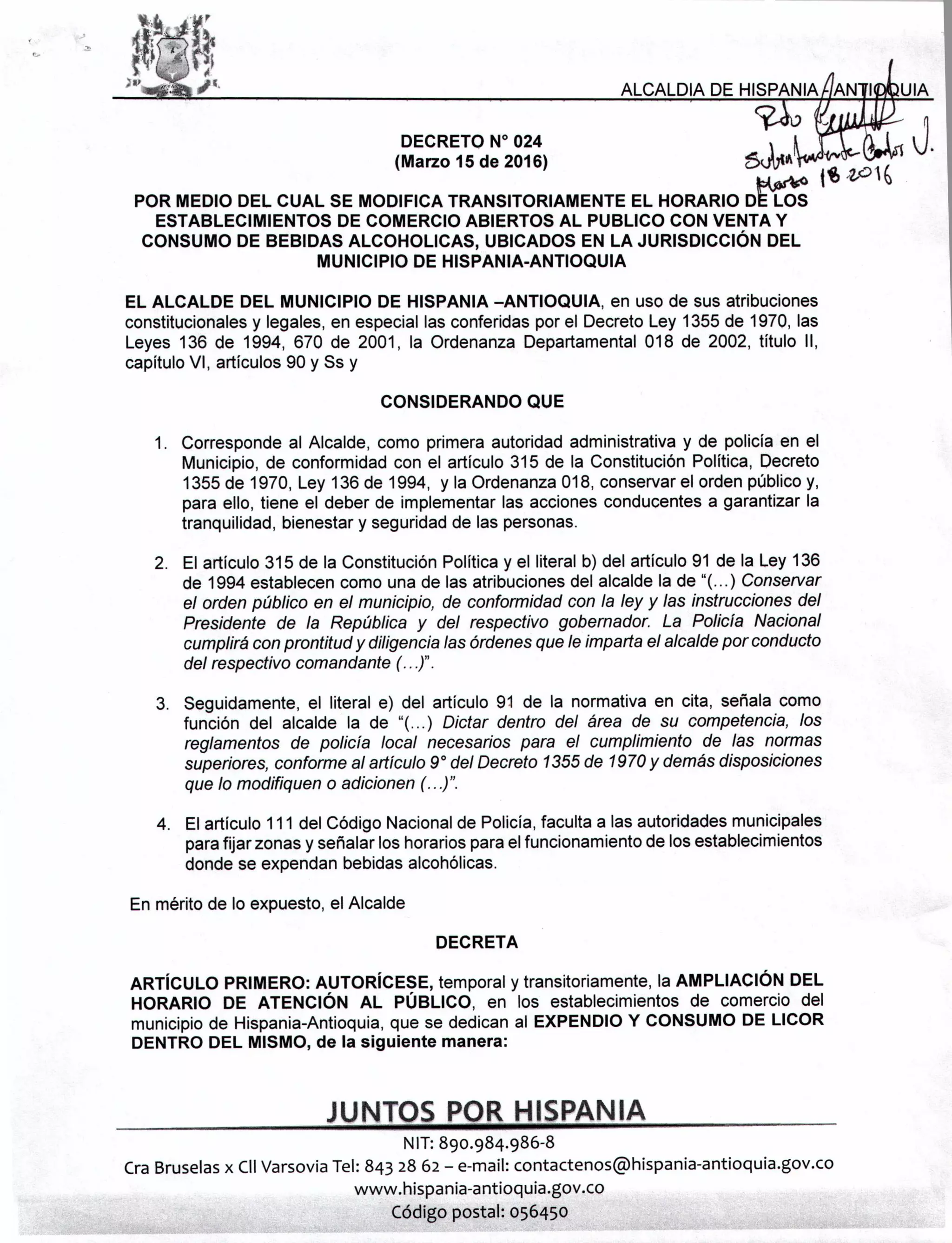 Este decreto modifica transitoriamente el horario de cierre de establecimientos comerciales en Hispania-Antioquia que venden bebidas alcohólicas para consumo en el local. Se amplía el horario de música hasta las 2:30 a.m. y el horario de cierre hasta las 3:00 a.m. los días 19, 20, 26 y 27 de marzo, sujeto al buen comportamiento ciudadano. El decreto también instruye al comandante de policía a vigilar el cumplimiento de la norma y su publicación en la p