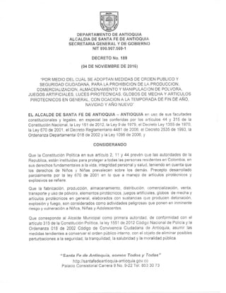 Decreto 189 " Pólvora " #todosytodas protegemos la navidad en familia “Por medio del cual se adoptan medidas de orden público y seguridad ciudadana, para la prohibición de la producción comercialización, almacenamiento y manipulación de pólvora, juegos artificiales, luces pirotécnicas, globos de mecha y artículos pirotécnicos en general, con ocasión a la temporada de fin de año, navidad y año nuevo”