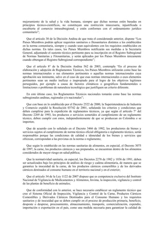 Este decreto establece el reglamento técnico para crear el Sistema Oficial de Inspección, Vigilancia y Control de la Carne, Productos Cárnicos y Derivados Cárnicos destinados para el consumo humano en Colombia. El sistema se basa en el análisis de riesgos y tiene como objetivo proteger la salud humana. Se aplica a todas las etapas de la cadena alimentaria de la carne, incluyendo producción primaria, beneficio, procesamiento, transporte, almacenamiento y comercialización. También define t