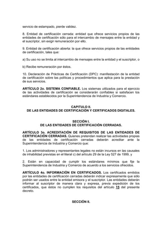 El Decreto 1747 de 2000 reglamenta parcialmente la Ley 527 de 1999 sobre entidades de certificación, certificados y firmas digitales en Colombia. Define conceptos clave como iniciador, suscriptor, certificado y los requisitos necesarios para las entidades de certificación cerradas y abiertas, incluyendo auditorías y garantías. Establece obligaciones y responsabilidades, asegurando que las certificadoras operen bajo estándares de seguridad y confianza establecidos por la Superintendencia de Industria y Comercio.