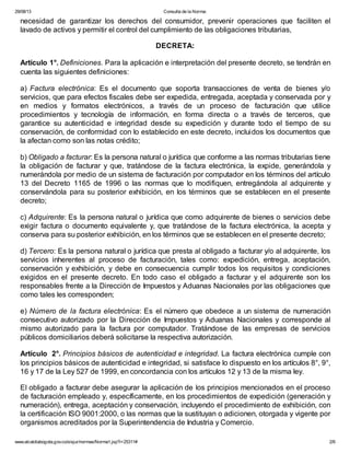 Este decreto reglamenta el uso de la factura electrónica en Colombia. Define factura electrónica y establece requisitos de contenido fiscal y técnico. Exige que se garantice la autenticidad e integridad a través de certificaciones ISO. Requiere que el emisor y receptor firmen un acuerdo y que se conserven por el mismo plazo que las facturas físicas. Faculta a la DIAN para establecer características técnicas adicionales.