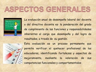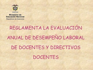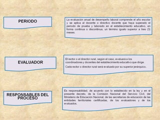 Este documento establece las pautas para la evaluación anual del desempeño laboral de docentes y directivos docentes. La evaluación busca verificar el cumplimiento de funciones, logro de resultados e identificar fortalezas y áreas de mejora mediante la valoración de competencias funcionales y comportamentales. El proceso evalúa la idoneidad, eficiencia y calidad de la educación. Los resultados alimentarán la autoevaluación institucional y los planes de mejora.