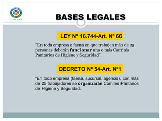 Este documento establece las normas para la constitución y funcionamiento de los Comités Paritarios de Higiene y Seguridad en las empresas. Se requiere que en empresas con más de 25 trabajadores se constituya un Comité Paritario formado por 3 representantes de los empleadores y 3 de los trabajadores. El Comité se encarga de la prevención de riesgos, la investigación de accidentes, y la capacitación en seguridad de los trabajadores.
