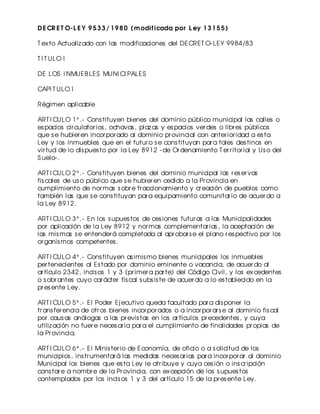 Este documento establece las normas sobre los inmuebles municipales y provinciales en la provincia de Buenos Aires. Define qué bienes forman parte del dominio público y privado municipal, y establece procedimientos para la transferencia de bienes entre la provincia y los municipios. También regula la calificación y tratamiento de excedentes y sobrantes fiscales resultantes de mensuras catastrales.
