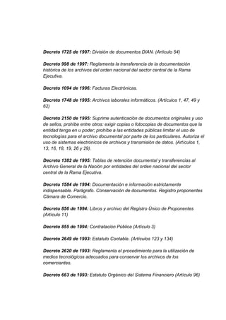 Este documento resume varios decretos colombianos relacionados con la normatividad archivística. Algunos decretos reglamentan aspectos como la gestión de documentos y expedientes en entidades públicas, la transferencia de documentos históricos a archivos nacionales, y el uso de tecnologías como archivos electrónicos y facturas digitales. Los decretos buscan regular la organización, conservación y acceso a documentos de entidades gubernamentales, comerciales y del sector privado.