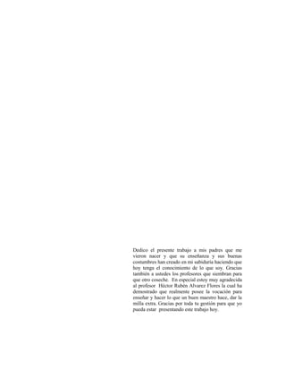El autor dedica su trabajo a sus padres por su enseñanza y buenas costumbres que le han dado sabiduría. Agradece también a sus profesores por sembrar conocimiento para que otros cosechen. En especial, agradece al profesor Héctor Rubén Alvarez Flores por demostrar su vocación para enseñar y dar más allá de lo requerido, lo que le permitió presentar este trabajo.