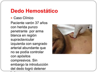 El documento describe un caso clínico en el que un paciente varón de 37 años con una herida punzo penetrante en la región supraclavicular tuvo un sangrado arterial incontrolable, el cual se detuvo mediante la introducción de un dedo hemostático. Se creó un dedo artificial con un guante para estabilizar la herida, logrando que el paciente no presentara sangrado a las 24 horas. Este procedimiento fue crucial para salvar la vida del paciente, quien no tenía acceso a un banco de sangre y mostraba signos de hemoneumotórax.