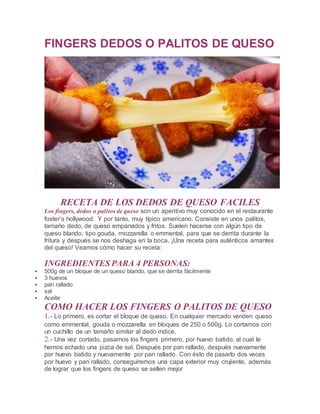 Los dedos de queso son un aperitivo típico americano que consiste en palitos de queso empanados y fritos para que se derrita durante la cocción. La receta indica cortar bloques de queso blando en palitos, pasarlos por huevo y pan rallado para rebozarlos, y freírlos en abundante aceite hasta que estén dorados. Una vez fritos, se colocan en papel absorbente antes de servirlos como un aperitivo crujiente con queso derretido en su interior.