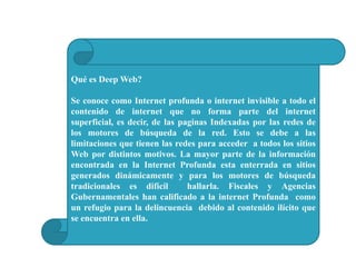 Este documento describe la Deep Web, que es el contenido de Internet que no es indexado por los motores de búsqueda principales. Explica que la Deep Web es mucho más grande que la Web superficial, conteniendo terabytes de información privada e ilegal. También describe cómo se puede acceder a la Deep Web de forma anónima a través de redes como Tor y cómo se realizan transacciones en la Deep Web utilizando criptomonedas como Bitcoin.