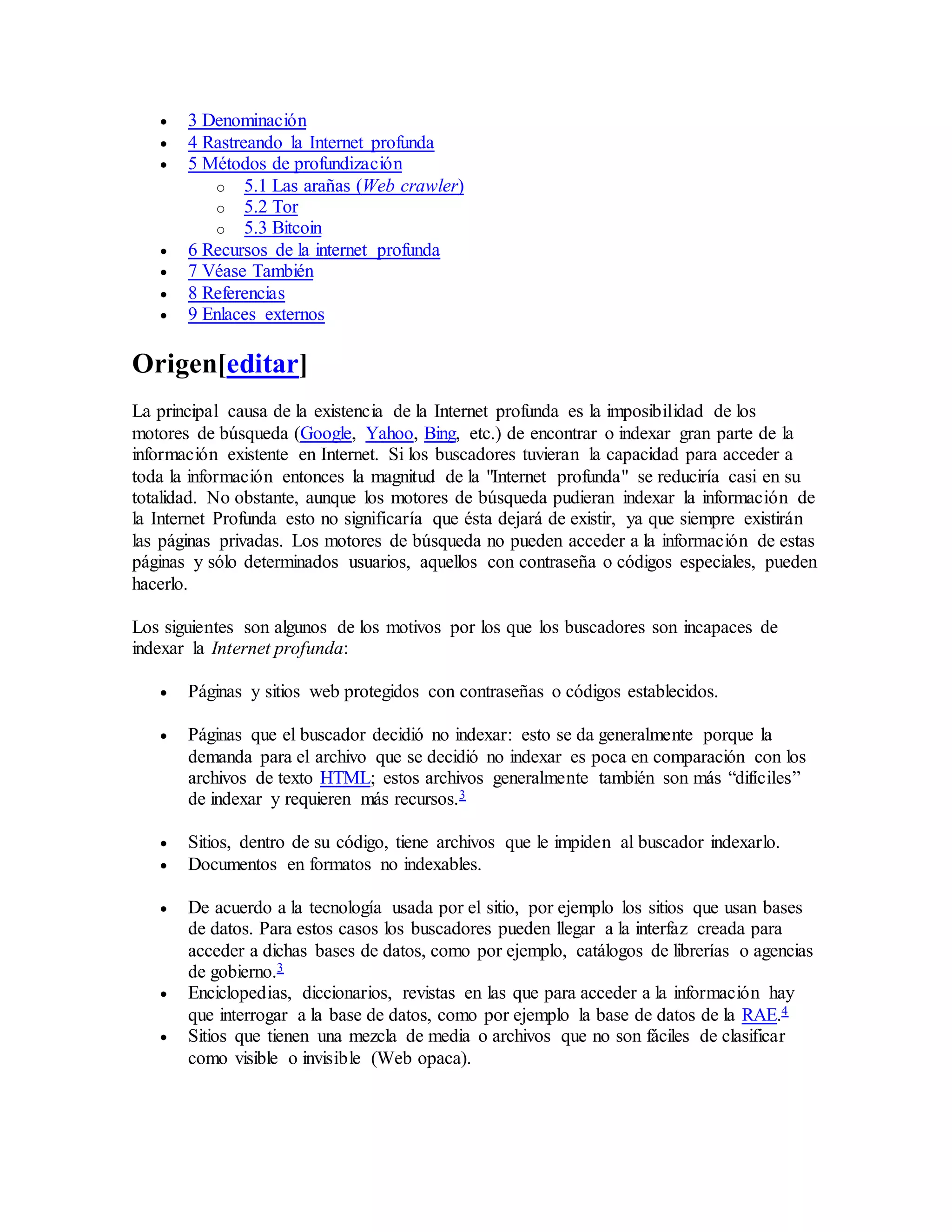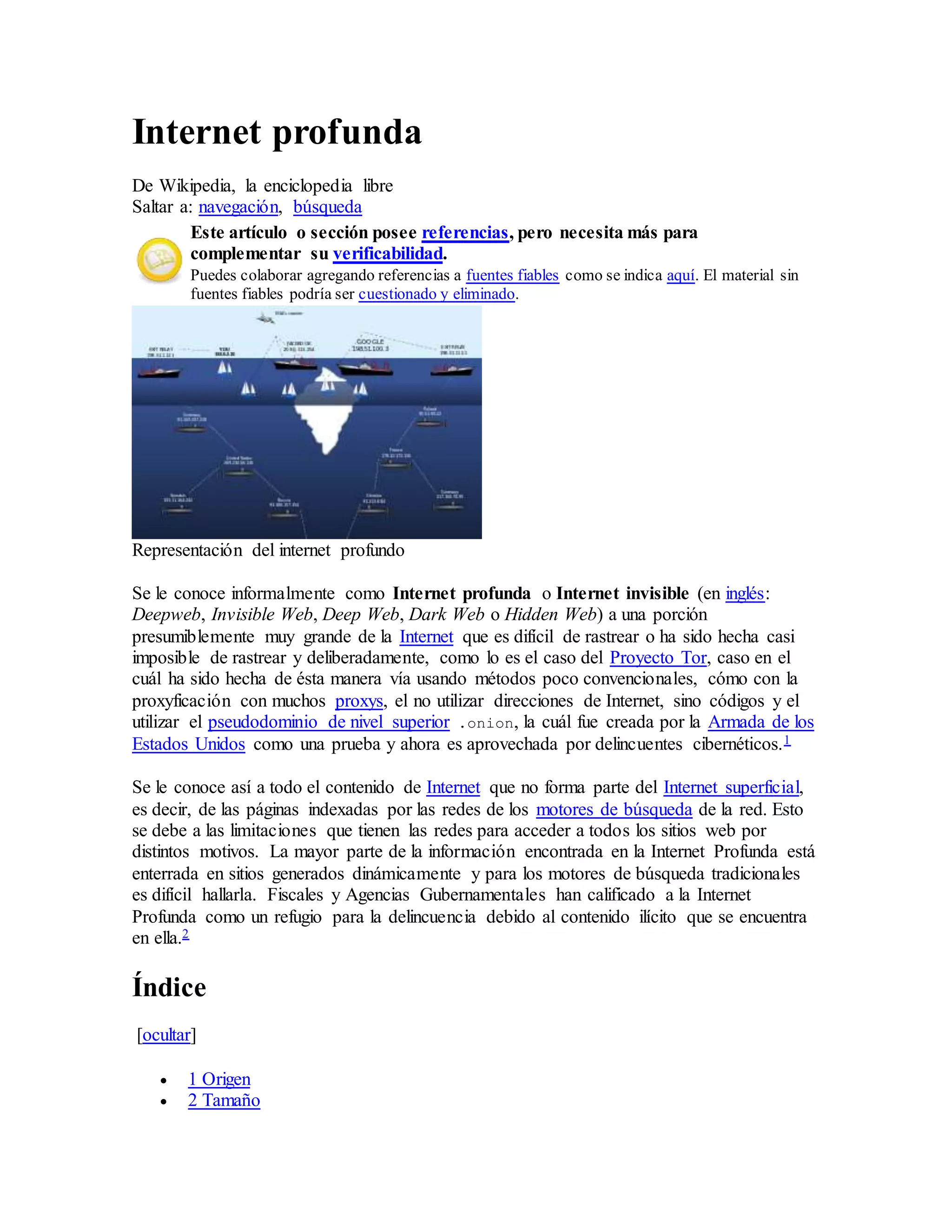 El documento describe la Internet profunda, que es una gran porción de contenido en Internet que no es indexada por los motores de búsqueda tradicionales. Se estima que la Internet profunda es 500 veces mayor que la Internet superficial y contiene información dinámica, privada y en formatos no indexables. El contenido de la Internet profunda solo es accesible a través de métodos como Tor o buscadores especializados.