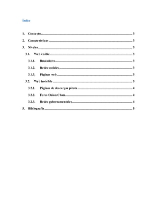 Este documento describe la web invisible o "deep web". Explica que es aquella información oculta en la web que no es rastreada por buscadores comunes. Se divide en dos niveles principales: la web visible, que incluye buscadores, redes sociales y páginas web; y la web invisible, que contiene páginas de descargas piratas, foros clandestinos y redes gubernamentales restringidas.