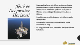 Deepwater Horizon fue una plataforma petrolífera en el Golfo de México que sufrió un derrame masivo de petróleo en 2010 debido a fallas en el equipo y negligencia de BP, resultando en serias consecuencias ambientales y económicas. El desastre afectó a miles de especies y provocó pérdidas significativas de empleo y alta inversión en limpieza, además de que BP asumió la culpabilidad y enfrentó cargos por negligencia y obstrucción. Investigaciones posteriores sugirieron que el accidente podría haberse evitado con mejores prácticas de seguridad y control.