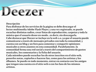 Este documento describe Deezer, un servicio de música en streaming. Los usuarios pueden escuchar música en línea sin descargarla, crear listas de reproducción y comunicarse con otros usuarios. El documento también describe las características y problemas de Deezer, como que requiere una cuenta de Facebook para registrarse.