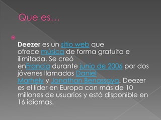 Deezer es un sitio web creado en Francia en 2006 que ofrece música gratis e ilimitada, con más de 10 millones de usuarios en Europa. Permite escuchar más de 4.5 millones de canciones, crear listas de reproducción, descubrir nuevos artistas y compartir gustos musicales con amigos.