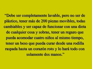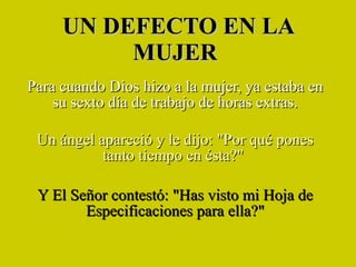 El documento describe la creación de la mujer por parte de Dios. Según el relato, Dios dedicó mucho tiempo y esfuerzo a crear a la mujer, dotándola de múltiples capacidades y cualidades para poder cumplir con diversas funciones y roles. A pesar de lo compleja que es la mujer, Dios la hizo fuerte y resistente. Finalmente, el documento destaca las grandes fortalezas de la mujer, aunque señala que a veces se olvida del gran valor que posee.