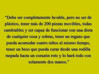 “ Debe ser completamente lavable, pero no ser de  plástico, tener más de 200 piezas movibles, todas  cambiables y ser capaz de funcionar con una dieta  de cualquier cosa y sobras, tener un regazo que  pueda acomodar cuatro niños al mismo tiempo,  tener un beso que pueda curar desde una rodilla  raspada hasta un corazón roto y lo hará todo con  solamente dos manos.”