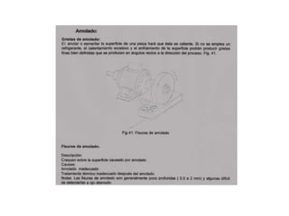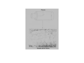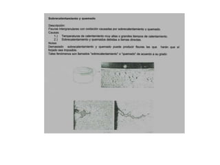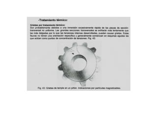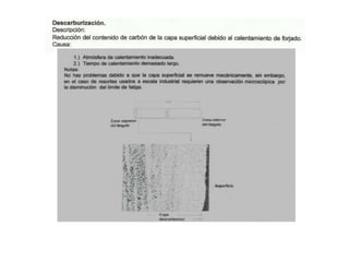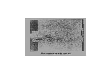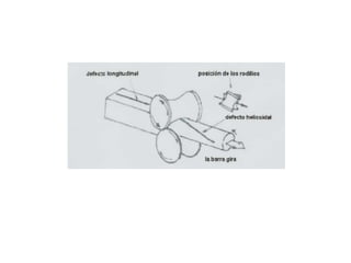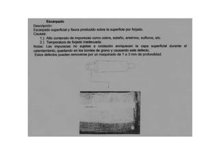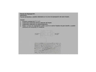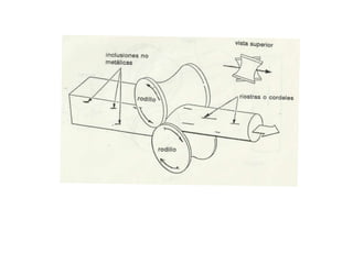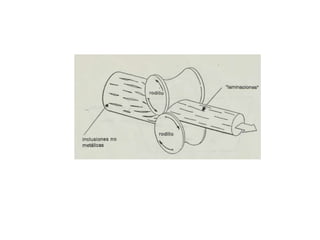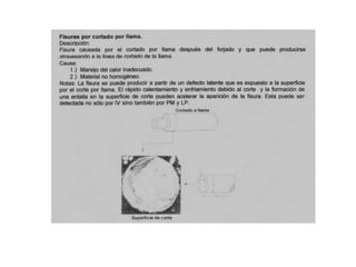 Este documento describe los diferentes tipos de defectos o discontinuidades que pueden presentarse en materiales durante su producción, procesamiento y servicio. Explica que una discontinuidad se convierte en defecto si no cumple con los criterios establecidos. Describe discontinuidades inherentes a la fundición como inclusiones no metálicas, poros y segregaciones, así como discontinuidades propias de procesos posteriores como laminaciones, pliegues de forja y defectos en soldaduras. El objetivo es identificar el origen de las discontinuidades para prevenir defectos.