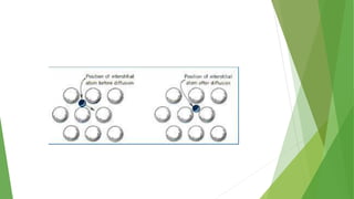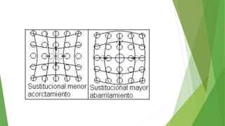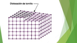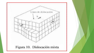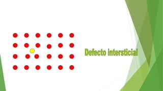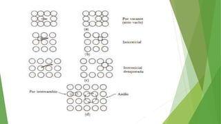 Los defectos en las estructuras cristalinas incluyen defectos puntuales (como vacancias y átomos intersticiales), defectos lineales (como dislocaciones) y defectos de superficie. Estos defectos afectan las propiedades de los materiales y pueden introducirse durante la solidificación, procesamiento o por dopado. Los defectos puntuales incrementan la resistencia mecánica mientras que las dislocaciones permiten la deformación plástica de los metales a través del movimiento de las dislocaciones.