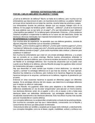 El documento describe una estrategia defensiva llamada "defensa Triángulo y Dos" para el baloncesto. Explica que esta defensa asigna a dos jugadores para marcar individualmente a los tiradores externos, mientras que los otros tres jugadores forman un triángulo en zona para cubrir el resto de la cancha. También destaca algunas ventajas tácticas de esta defensa, como atacar sistemas sin un tercer tirador fiable o detener anotadores en rachas. Sin embargo, advierte que esta defensa requiere mucha pr