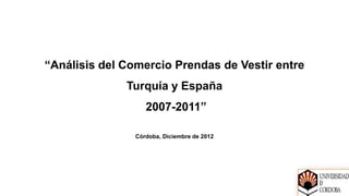 Este documento presenta un análisis del comercio de prendas de vestir entre Turquía y España entre 2007-2011. Incluye una introducción y cuatro capítulos que cubren la perspectiva general de Turquía, la situación internacional del sector textil, el comercio específico entre los dos países, y las conclusiones y recomendaciones.