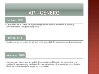 El documento aborda el vínculo entre el aprendizaje permanente y la promoción de la igualdad de género en el contexto de la justicia social. Se plantean objetivos para describir el aprendizaje permanente, identificar percepciones en adultos de diferentes orígenes socioeconómicos y detectar acciones que fomentan la igualdad de oportunidades de género. La investigación es de tipo mixto y se basa en la participación de 300 sujetos en Chile, utilizando entrevistas y análisis cualitativo de datos.