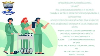 El documento describe una investigación sobre la interpretación de los cuidados de enfermería en el cateterismo arterial invasivo en unidades de cuidados intensivos. El objetivo es analizar publicaciones sobre este tema para comprender mejor los cuidados requeridos. Se realizó una revisión bibliográfica de 40 artículos científicos utilizando bases de datos. Los resultados cubren indicaciones para el cateterismo arterial invasivo, complicaciones potenciales y los cuidados de enfermería necesarios. Se discuten factores como la duración del cateterismo y la elección de la extremidad superior