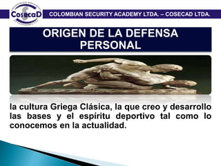 El documento proporciona información sobre diferentes estilos y técnicas de defensa personal, incluyendo su origen y filosofía. Describe tácticas para contrarrestar ataques como estrangulaciones, agarres y golpes, destacando la importancia de la legitima defensa y el uso racional de la fuerza.