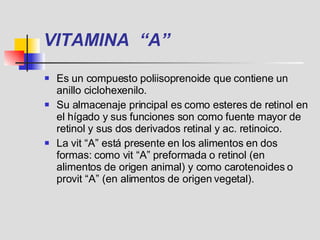 El documento describe la vitamina A, incluyendo su estructura, fuentes, metabolismo, requerimientos, deficiencia y tratamiento. La vitamina A es importante para la visión, el crecimiento, la inmunidad y otras funciones. Su deficiencia puede causar xeroftalmia y ceguera si no se trata, y se asocia con mayor riesgo de infecciones. El tratamiento de la deficiencia incluye dosis altas de vitamina A oral o inyectable.
