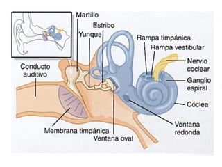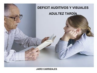 El documento habla sobre los déficits auditivos y visuales que ocurren en la adultez tardía. Explica que la presbiacusia, o pérdida auditiva relacionada con la edad, es común y puede empeorar por ruidos fuertes o medicamentos. También cubre las causas comunes de déficit visual como la presbicia, cataratas, degeneración macular y glaucoma. Finalmente, ofrece recomendaciones para la prevención, detección temprana y manejo de estos déficits.