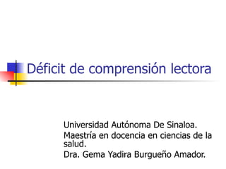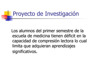Este documento describe un proyecto de investigación sobre el déficit de comprensión lectora en estudiantes de primer semestre de medicina. El objetivo es conocer el grado de déficit y su impacto en el aprendizaje significativo. Se revisan los antecedentes y la importancia de la comprensión lectora. La hipótesis es que los estudiantes sin las herramientas adecuadas para la comprensión lectora no tendrán aprendizajes significativos. Se detallan los objetivos, métodos, marco teórico y proceso de re