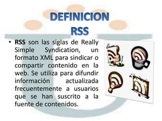 El documento describe las herramientas RSS (Really Simple Syndication) y lectores RSS. RSS es un formato XML para compartir contenido actualizado de sitios web con usuarios suscritos. Los lectores RSS permiten recibir automáticamente actualizaciones de sitios web favoritos sin necesidad de visitarlos individualmente. Existen lectores RSS que se instalan localmente, lectores en línea, y funciones RSS integradas en navegadores y correo electrónico.