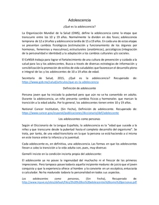 Este documento define la adolescencia como la etapa entre los 10 y 19 años, dividida en adolescencia temprana (12-14 años) y tardía (15-19 años). Durante la adolescencia ocurren cambios fisiológicos, estructurales, psicológicos y de adaptación social impulsados por las hormonas. El objetivo es promover estilos de vida saludables que favorezcan el desarrollo integral de los adolescentes. Cada adolescente experimenta esta transición de manera única mientras se forma su identidad personal entre la infancia y la juventud.
