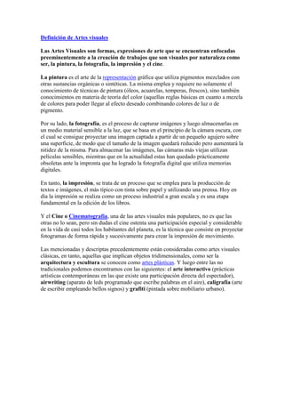 Las artes visuales incluyen formas de arte como la pintura, fotografía, impresión y cine que crean obras visuales. La pintura utiliza pigmentos mezclados con sustancias para representar gráficamente, la fotografía captura imágenes en medios sensibles a la luz, la impresión reproduce textos e imágenes de forma industrial, y el cine crea la ilusión de movimiento proyectando rápidamente fotogramas. Las artes visuales clásicas representan objetos bidimensionales, mientras que las artes plá
