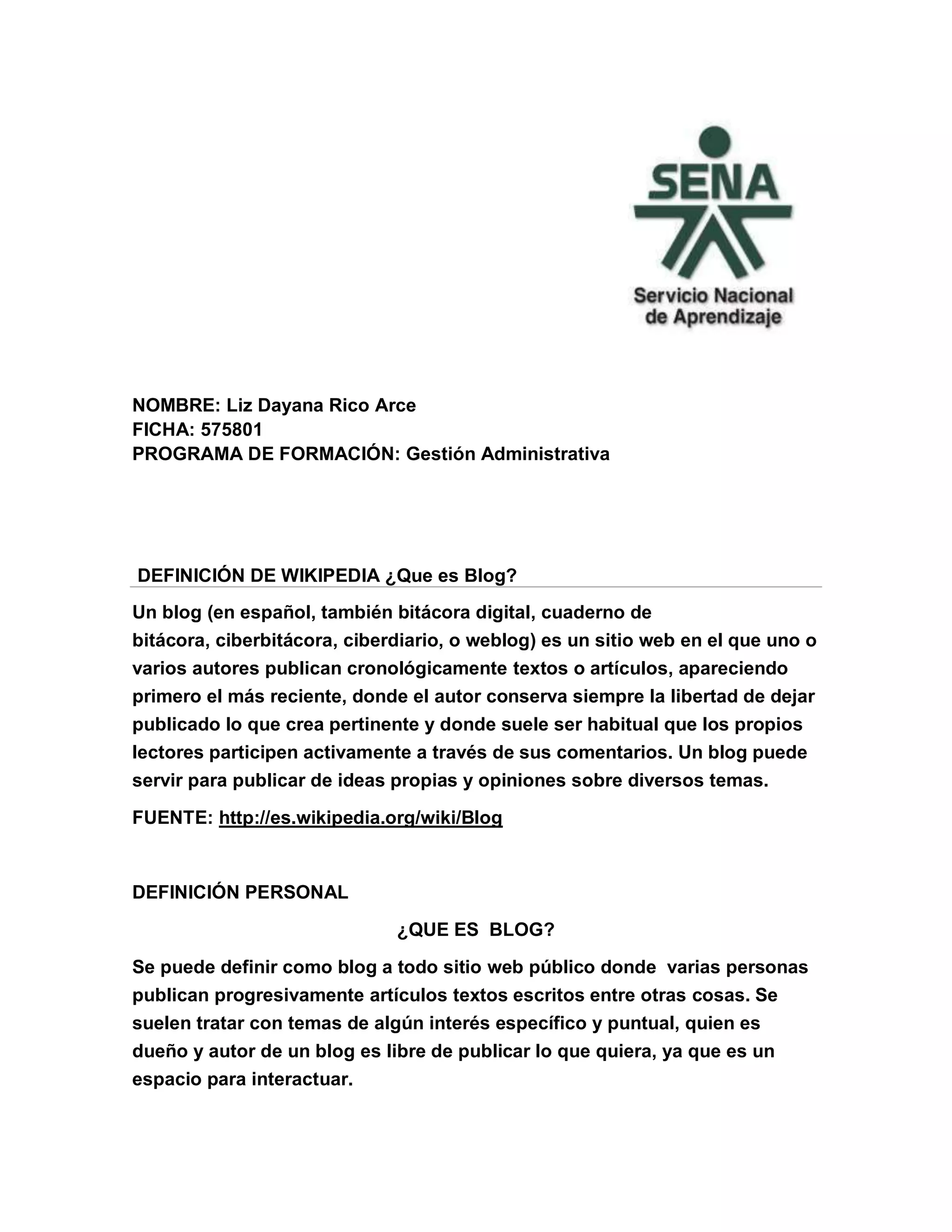 El documento presenta la definición de blog según Wikipedia, la cual describe un blog como un sitio web en el que uno o más autores publican artículos de forma cronológica, con el más reciente primero, y donde los lectores pueden comentar. También incluye la definición personal de la autora, la cual describe un blog como un sitio web donde varias personas publican progresivamente artículos sobre temas de interés, y cuyo autor es libre de publicar lo que quiera para interactuar.