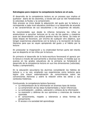 El documento define la competencia lectora y ofrece estrategias para mejorarla en el aula. Define la competencia lectora como la capacidad de comprender e interpretar textos escritos para lograr metas personales y participar en la sociedad. Recomienda que desde la infancia temprana los niños se acostumbren a escuchar lecturas para desarrollar una actitud positiva. A medida que los estudiantes avanzan en primaria y secundaria, se fortalecerán las tres dimensiones de la lectura - velocidad, fluidez y comprensión -