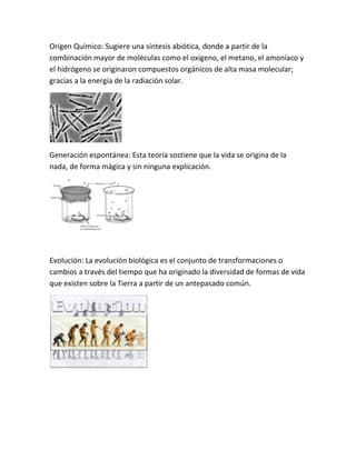 El documento presenta varias teorías sobre el origen de la vida: la abiogénesis sugiere que la vida surge de la materia inerte, mientras que la panspermia propone que la vida llegó a la Tierra desde el espacio. Otras teorías incluyen un origen químico a partir de moléculas orgánicas simples y la generación espontánea. La evolución biológica explica la diversidad de vida a partir de un antepasado común, mientras que Lamarck y Darwin propusieron mecanismos como la herencia