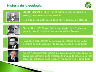 La ecología pretende comprender los fenómenos naturales, conocer el ambiente y analizar la diversidad climática para saber utilizar los recursos naturales y mantener el equilibrio ecológico. La ecología ha evolucionado desde su definición original como el estudio de las relaciones entre animales y plantas hasta convertirse en una ciencia integradora que estudia los organismos y sus interacciones con el medio ambiente a todos los niveles.